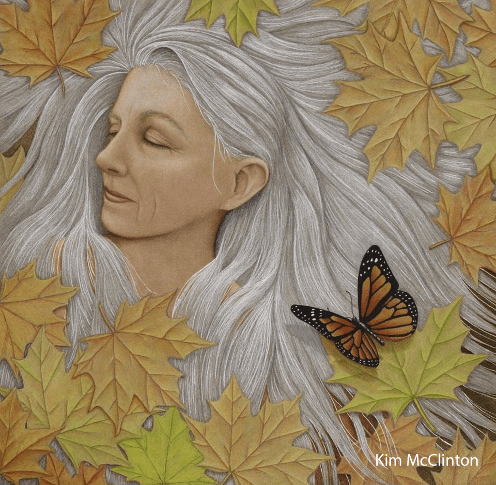 2. Your artwork is describes as ‘Self-portrait with silver hair, autumn leaves, and a single monarch butterfly.’ How did you decide on these specific elements, and what do they symbolize in the context of your life and the theme of the contest?